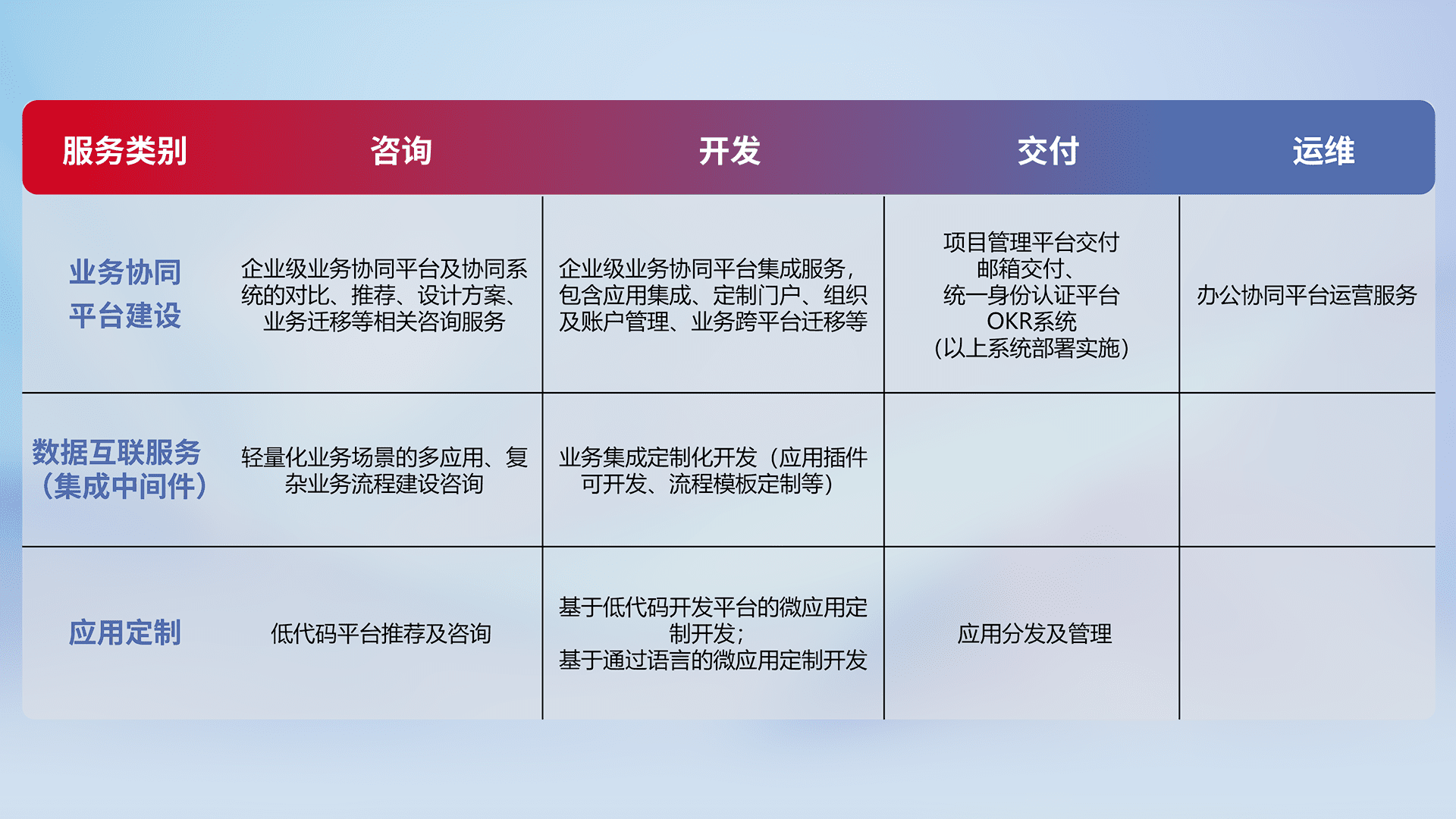针对钉钉、、、企微、、、、IDaas等平台级产品提供产品的规划、、、方案、、交付、、、、定制化开发等服务,,,,实现如统一协同办公、、、、智能客户服务、、、混合会议管理、、、智能数据查询、、、等业务场景,,,,实现数字化转型。。